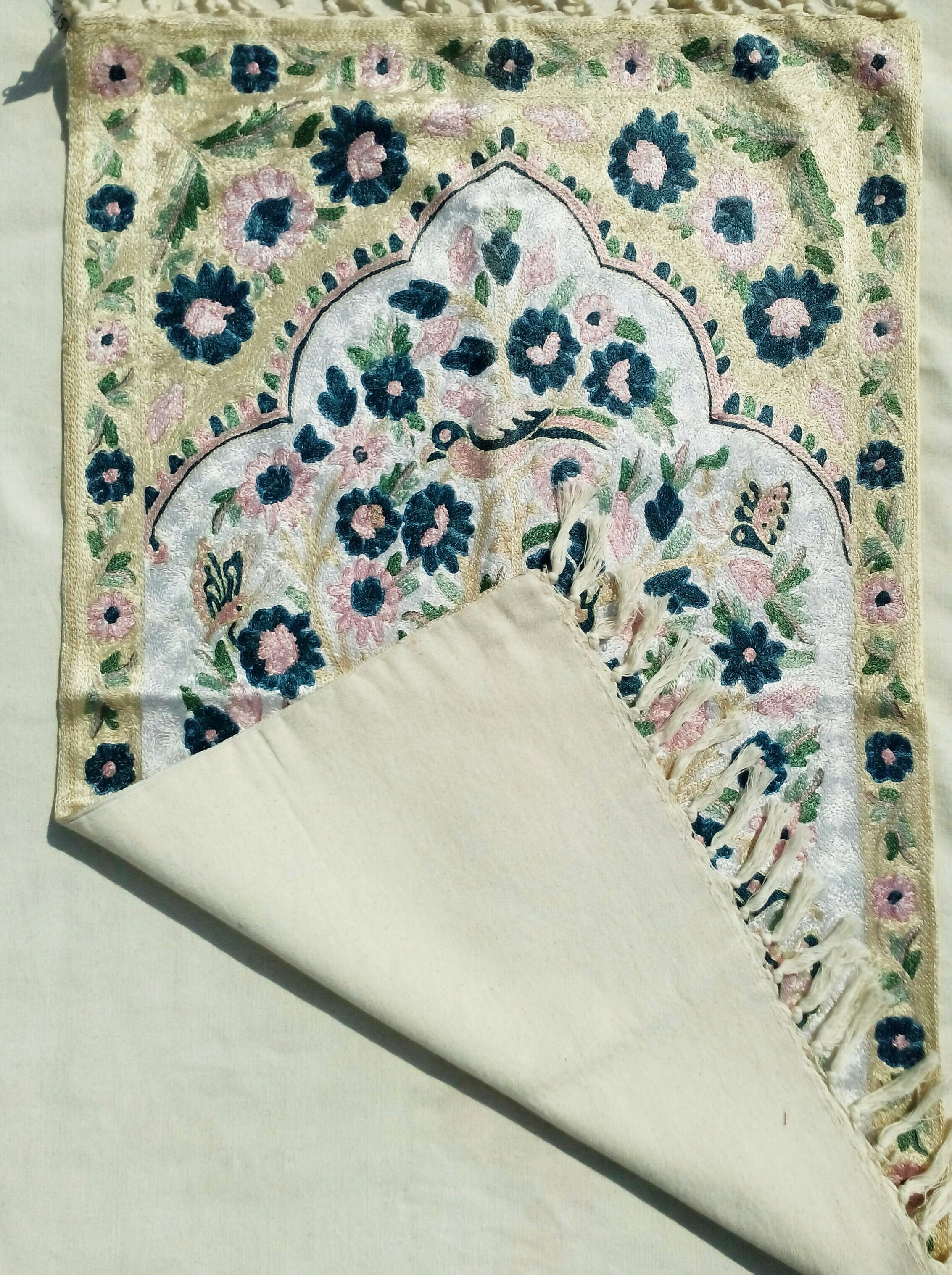 95cm×横60cmのカシミールラグです。生命の木がモチーフとして使われ、シルクで手刺繍されています。壁に飾って、タペストリーとして、お楽しみください。フリンジ部分は長さに含まれていません。裏はコットンキャンバス生地です。